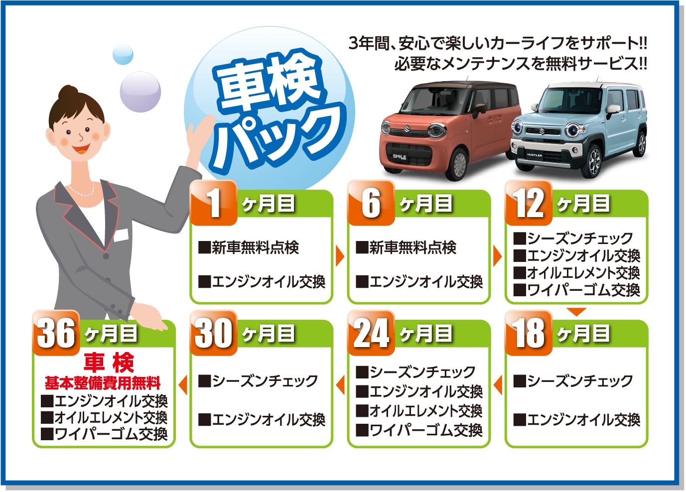 安心で楽しいカーライフのために必要な各種点検や部品交換、そして車検までを「車検パック」としてご用意。3年間のエンジンオイル、オイルエレメント、ワイパーゴムの交換に加え、さらに夏・冬前のシーズンチェック点検も含めたおトクなメンテナンスパックが39,800円※とおトクで便利なメンテナンスシステムです。愛車のためにしっかり整備しておくことが重要です。